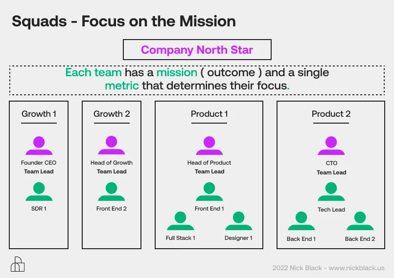 팀 변경 시점에 프로덕트 팀은 두 개의 스쿼드로 분리하기로 결정했다. 당시 프로덕트 팀의 조직 구성은 다음과 같았다.