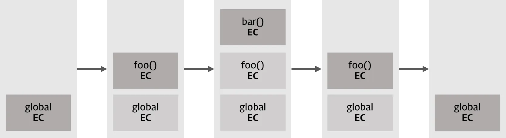 위 코드를 실행하면 아래와 같이 실행 컨텍스트 스택이 생성되고 소멸한다. 현재 실행중인 컨텍스트에서 이 컨텍스트와 관련 없는 코드(예를 들어 다른 함수)가 실행되면 새로운 컨텍스트가 생성된다. 이 컨텍스트는 스택에 쌓이게 되고 컨트롤(제어권)이 이동한다.